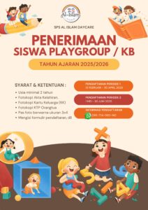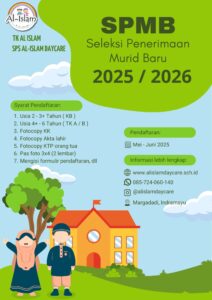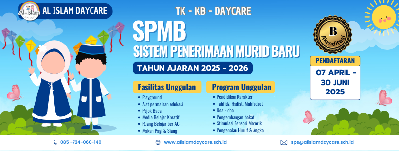 Mari bergabung bersama TK AL ISLAM, tempat tumbuh kembangnya generasi cerdas, ceria, dan berakhlak mulia. Bersama kami, buah hati Anda akan belajar dengan cinta, bermain dengan gembira, dan tumbuh dalam suasana islami yang hangat dan menyenangkan.